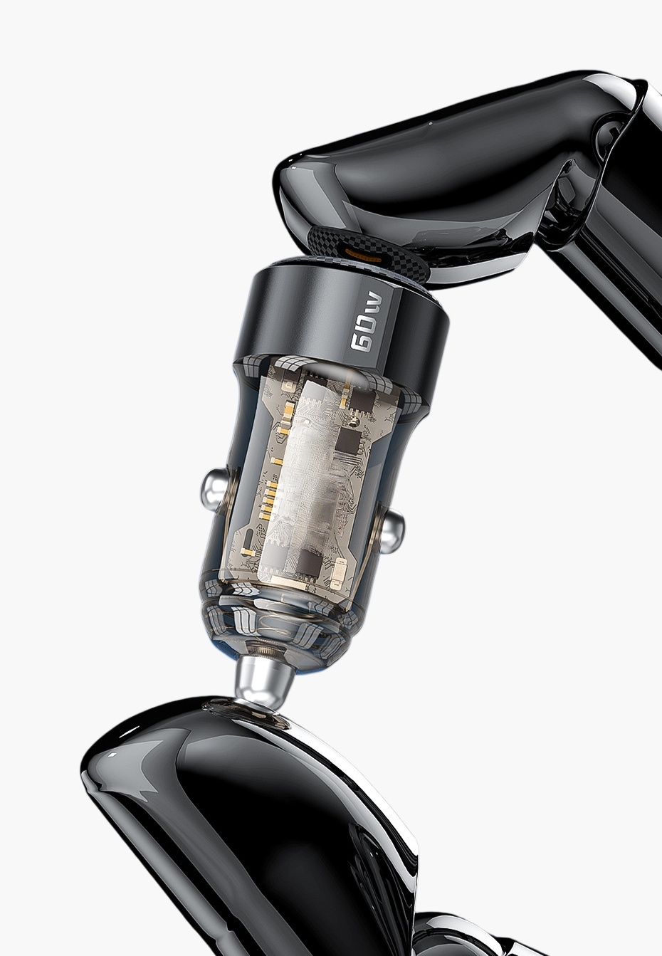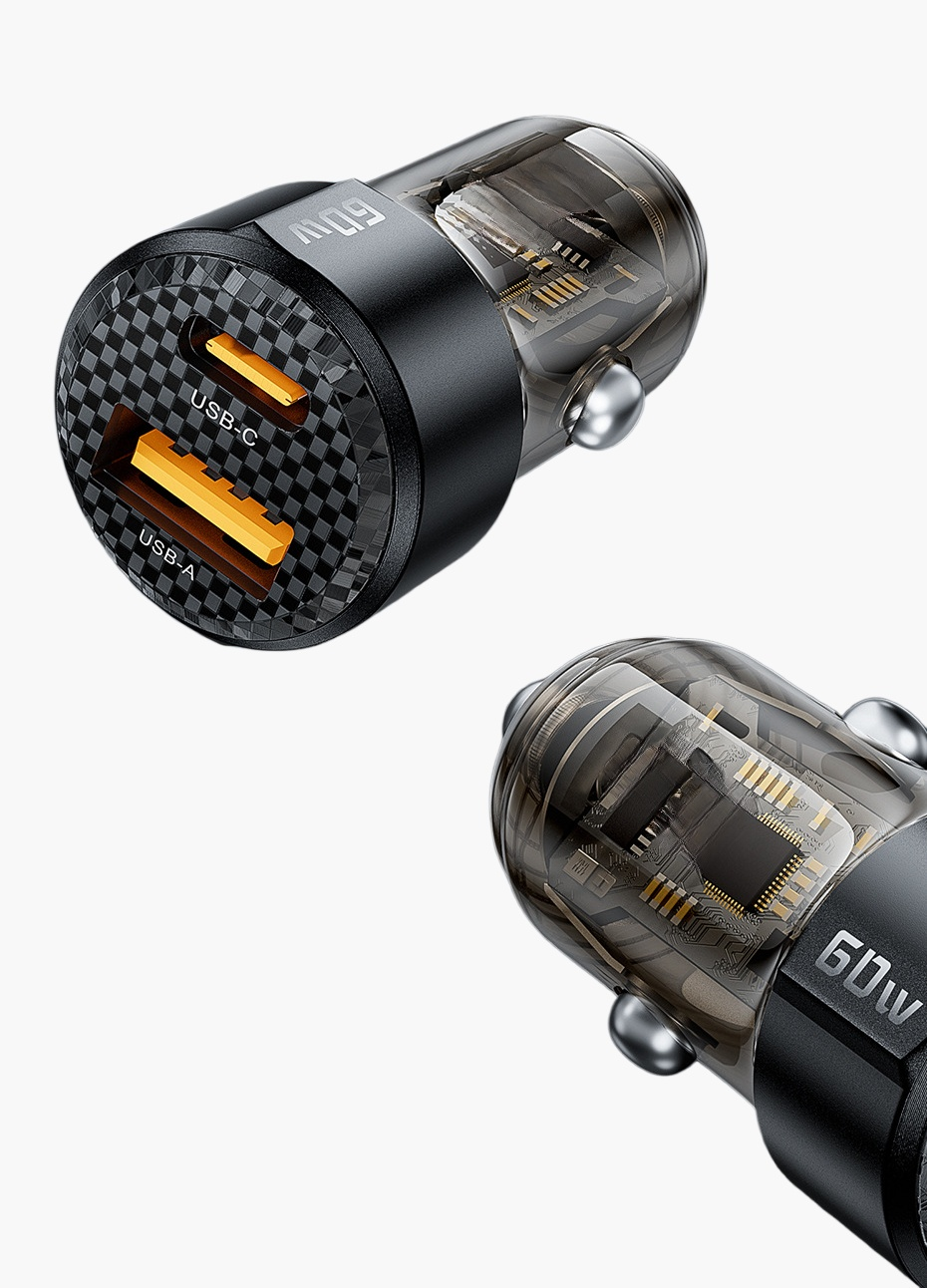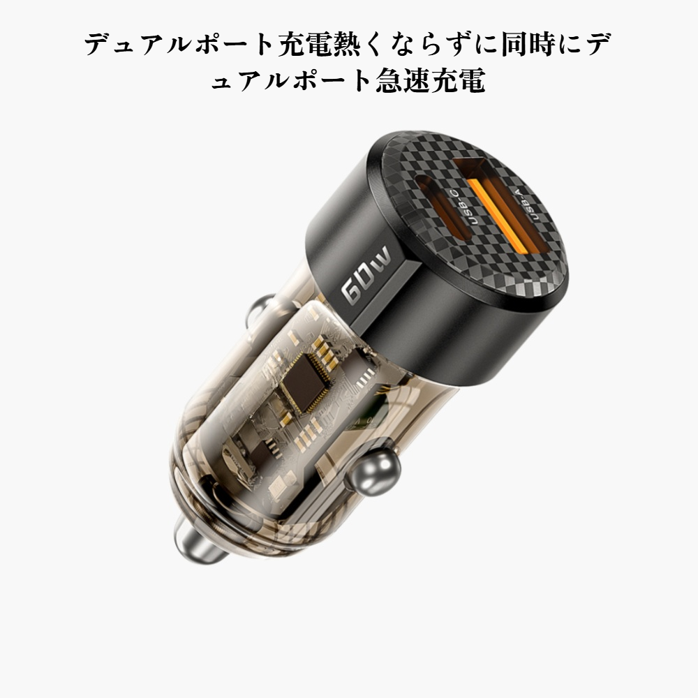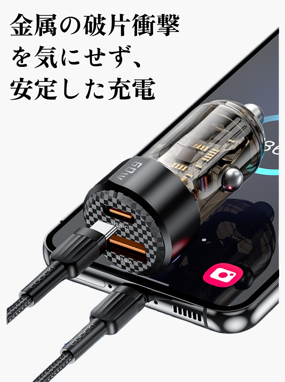ミニ超急速充電カーチャージャーは、コンパクト設計で車内スペースを節約。最大出力によりスマートフォンやタブレットを短時間で充電可能。